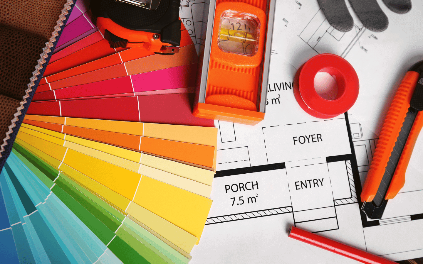 Una paleta de colores sobre una mesa con planos y lapices.